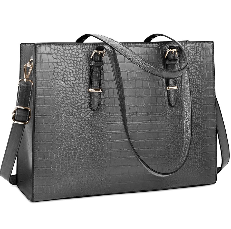 A grey crocodile-embossed tote bag with spacious design and detachable strap. Elegant and durable for work or travel.
